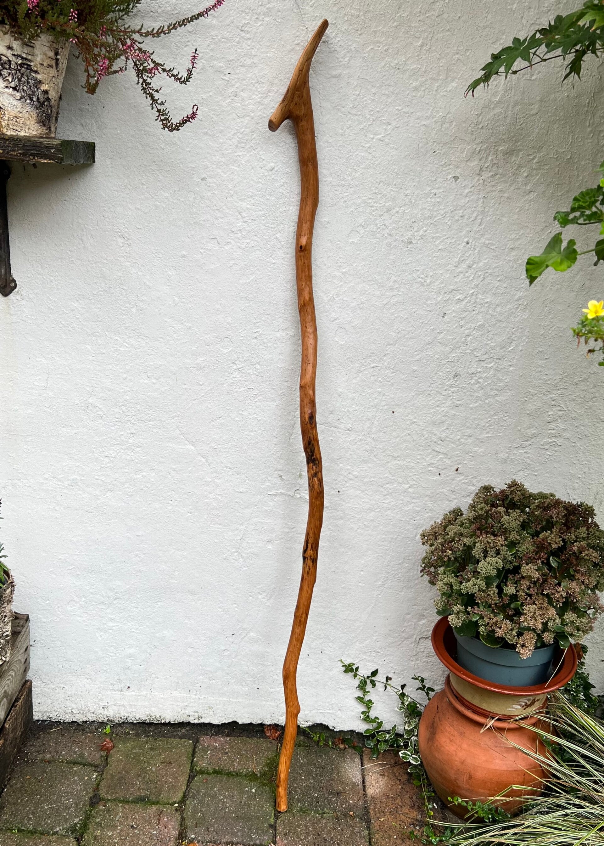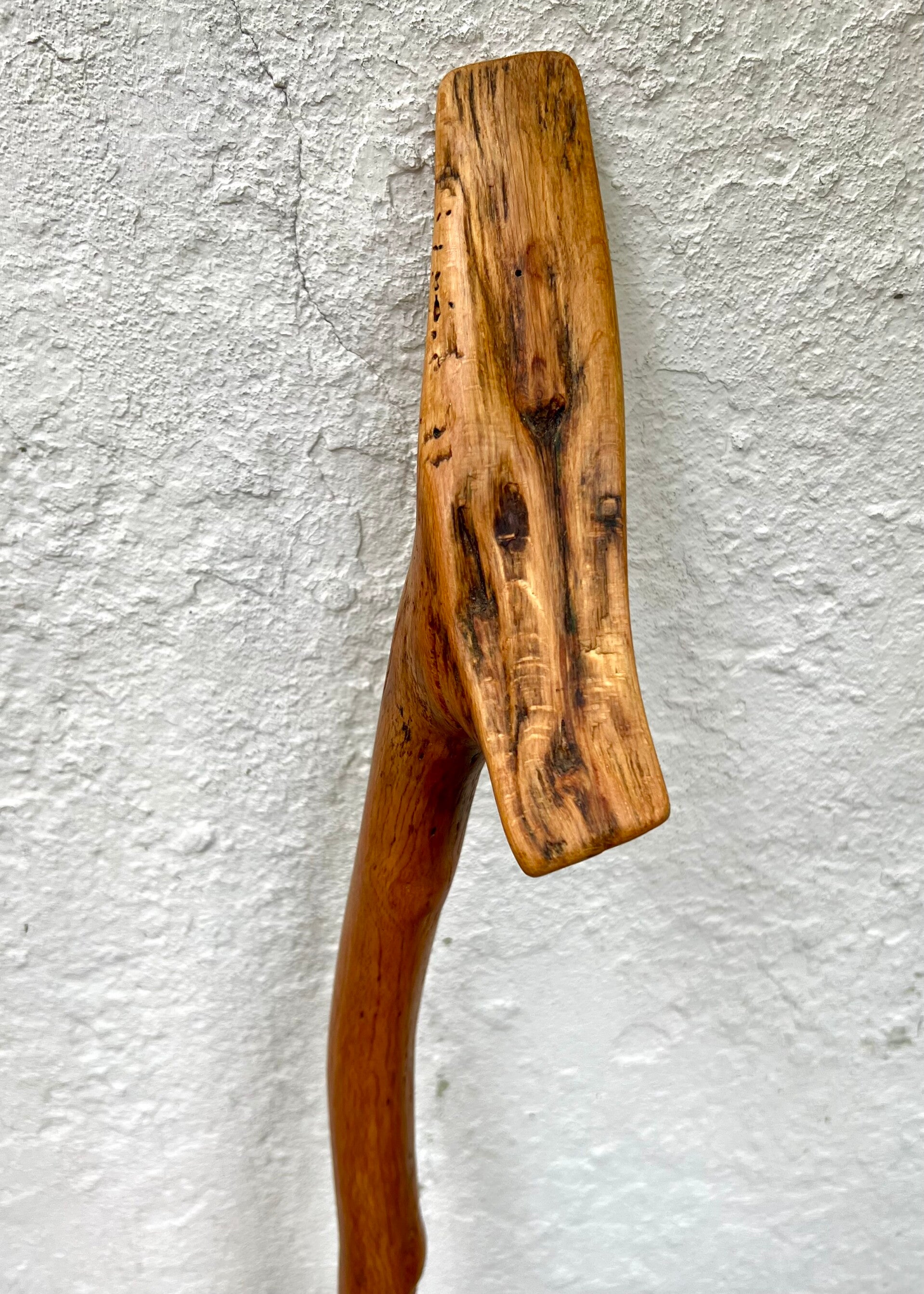 Grillig gevormde stok met diepbruine licht glanzende kleur. De kop is bijzonder. op verzoek kan er een polsbandje aaan gemaakt worden.