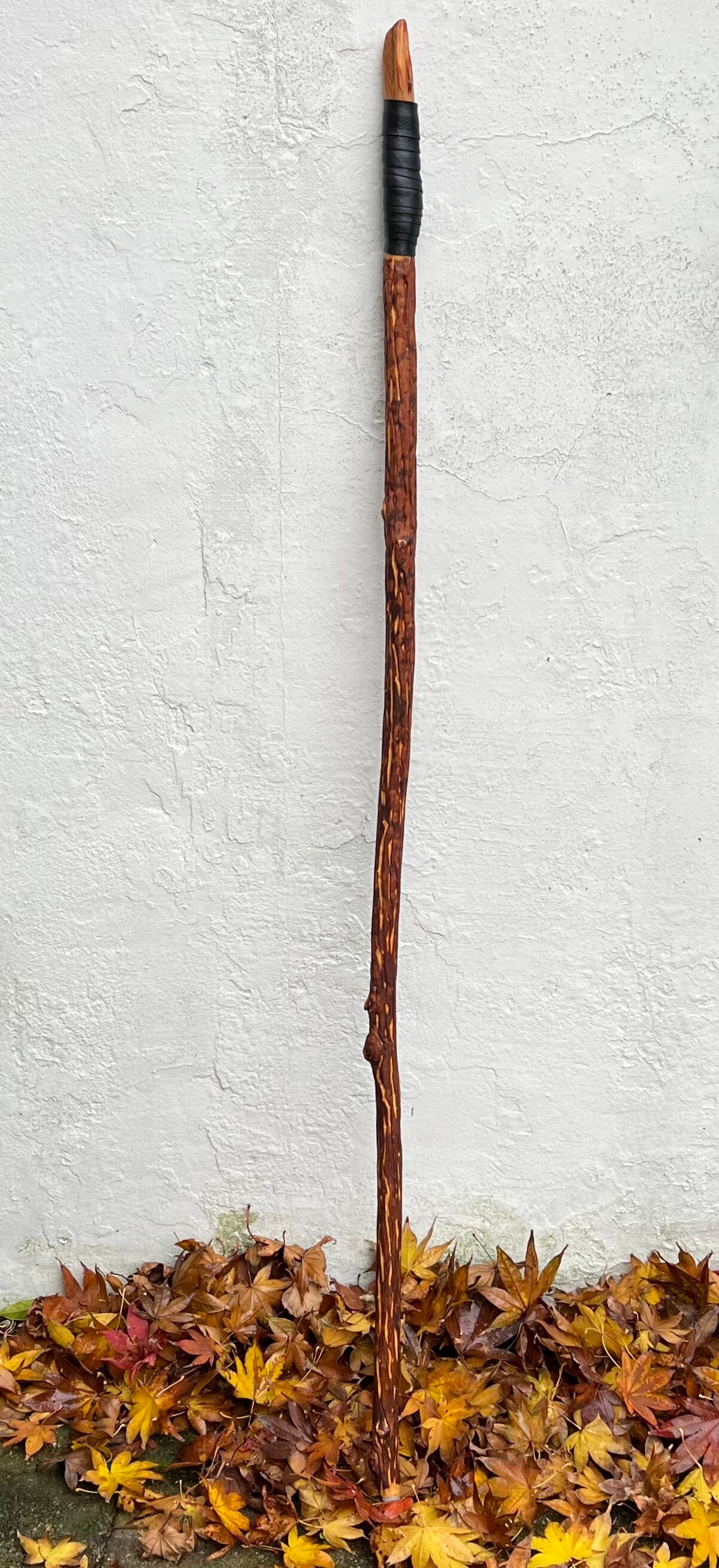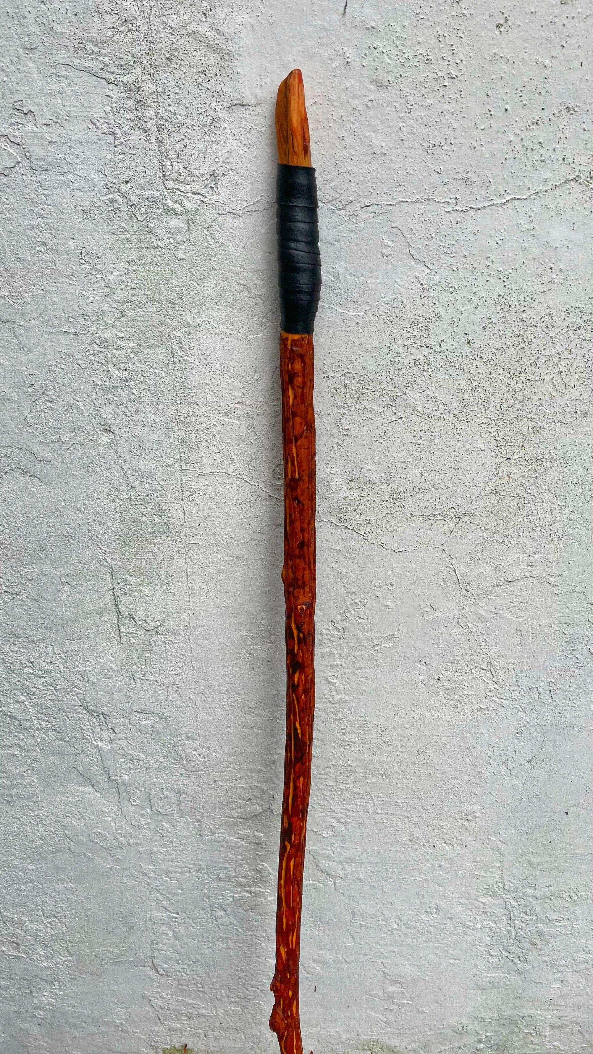 Deze prachtige walking stick is gemaakt van een Lariks tak. Lariks heeft een gele mooi me kleur en ziet er niet alledaags uit. Het handvat is van kunstleer.
